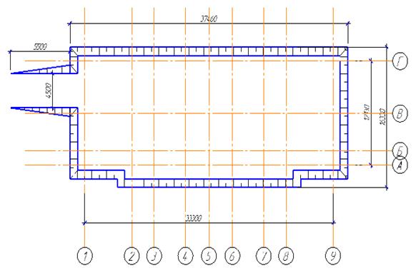 Определяем ширину котлована bк – ширина котлована по дну Bк – ширина котлована на отметке -1,200 (по верху котлована) bк=(12130+2∙1000+2∙ 600) =15330мм Вк=bк+2∙500=16330мм Определяем длину котлована lк – длина котлована по дну Lк – длина котлована на отметке -1,200 (по верху котлована) lк=(33300+2∙980) =36460мм Lк=lк+2∙500=37460мм