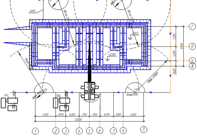 По данным параметрам подбираем кран МКГ-25 со стрелой L=17,5м. 1. Максимальная высота подъема крюка, обусловлена котлованом и конструкцией такелажных приспособлений: Нкр=Нзап+Нэл+Нстр=2,3+0,6+4=7(м) 2. Максимальная масса монтируемого элемента: М=Мдет+Мт.п.=5,+0,037=5,037(т) М – требуемая оптимальная грузоподъемность крана Мдет – максимальная масса монтируемого элемента Мт.п. – масса такелажных приспособлений 3. Максимальный вылет крюка при подаче наиболее удаленного элемента (определяется графически): lкр=6,0+1,0+0,6+4,0+2,0=13,5(м) Схема движения крана