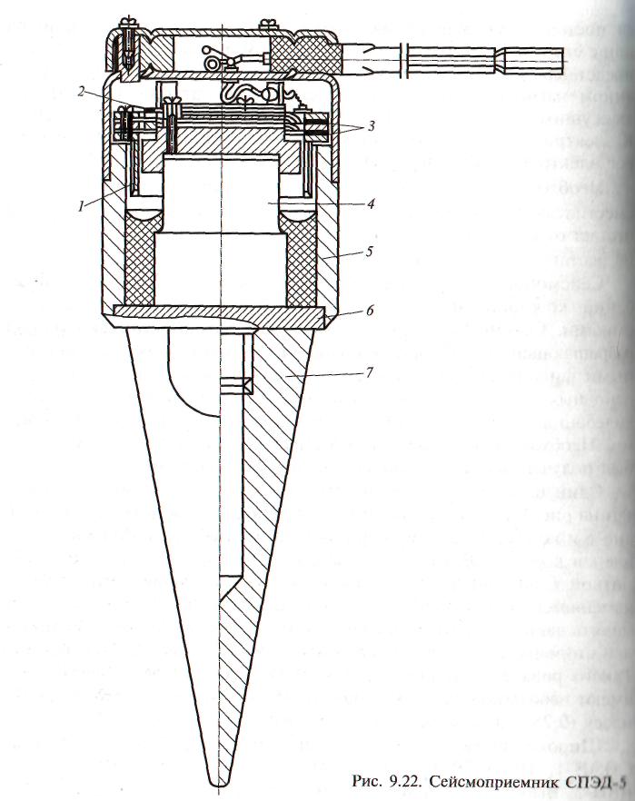 Постоянный магнит с полюсным наконечником 4, дно 6и корпус 5 прибора образуют магнитную цепь. Магнит укреплен в корпусе. В кольцевом зазоре перемещается катушка с обмоткой 1, подвешенной на двух пружинах 3. Рабочая длина пружин меняется перемещением регулирующих шайб 2, что позволяет менять частоту собственных колебаний на несколько герц. С внешней стороны к дну прибора крепится шток 7 в виде полого конуса. Такого рода сейсмоприемники (СПЭД-5, СПЭД-56, «Светлячок») имеют небольшие размеры (диаметр 35...46 мм, высота 66...70 мм) и массу (0,25...0,6 кг) и удобны при группировании. Широко применяют следующие типы приборов: СП-16М, СПЭН-1, НС-3, СВМ, ВНИМИ-1, ВНИМИ-2, ВЭГИК, ВИБ-А, Электрические колебания, соответствующие сейсмическим, поступают)Т с сейсмоприемника на электрические усилители, которые в десятки, а иногда в сотни и в тысячи раз усиливают поступающие слабые электрические напряжения. Усилители выполняют также и функцию частотной фильтрации сейсмических колебаний, когда необходимо погасить интенсивные низкочастотные волны, например волны-помехи, поверхностные волны. Иногда помехами могут оказаться микросеймы, высокочастотные сейсмические колебании вызываемые ветром, морским прибоем, реверберацией и т. п. Магнитную запись сейсмических колебаний осуществляют с помощью магнитного регистратора, запись колебаний на бумаге с помощью шлейфовых или электростатических осциллографов. Могут применяться электротермический, электрохимический и другие способы записи колебаний. Широкое применение находят полевые сейсмические станции «Поиск-1-24-МОВ-ОВ», «Поиск- 1-48-МОВ-ОВ», «Поиск-1-24-КПМВ», которые имеют 24 или 48 сейсморегистрирующих каналов, осуществляющих одновременную запись на магнитную ленту сейсмических колебаний, зарегистрированных сейсмоприемниками в 24 или 48 точках профиля наблюдений. Сейсмостанции работают с взрывной машинкой СВМ, обеспечивающей регистрацию на одной из дорожек магнитной ленты импульса и момента взрыва, необходимою для отсчета времени прихода волн. Большое значение придается обработке полевых лент. Современные электронные регистраторы позволяют сохранить весь процесс в цифровом виде для последующего анализа на ЭВМ.
