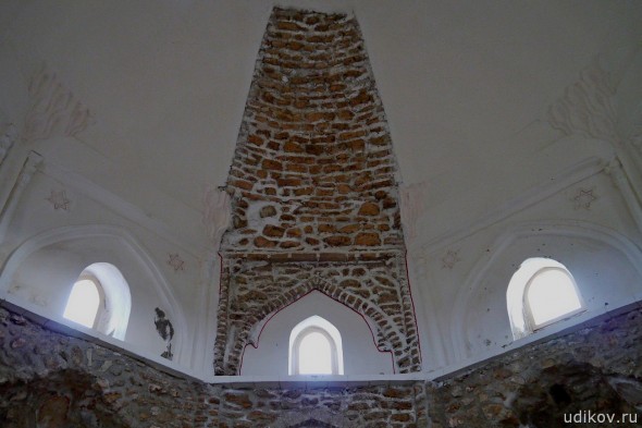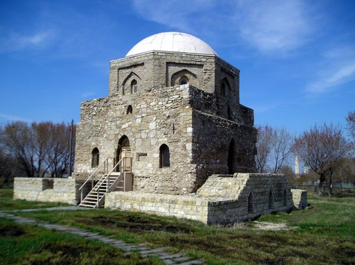 Среди сохранившихся памятников заслуживает внимания так называемая «Черная палата», датируемая серединой XIV в. Сооружение окутано романтическим ореолом легенд и преданий. Одно из них связано со взятием города Булгара золотоордынским ханом Булат Тимуром. О назначении «Черной палаты» также существует несколько различных мнений. Одни считают его «Судной палатой» (К. Кафтанников), другие — мавзолеем или мечетью. В то же время ряд исследователей вполне обоснованно отвергают назначение «Черной палаты» как судной (В. Ф. Смолин, А. А. Дмитриев, И. Н. Бе-резин и др.) и этого мнения придерживаются археологи. «Черная палата», вероятнее всего, представляла собой ханаку для странствующих дервишей с кельями по типу подобного рода построек, например, в Евпатории и Бухаре. Еще в сасанидском Иране ханаки строились с 4 входами и обходным коридором, имевшим вид кулуаров со сплошными стенами, или сводчатой галереи, или открытой террасы по основанию, представлявшей одноэтажный пристрой с кельями для дервишей. Этот коридор служил для религиозных церемоний. Сохранившийся до наших дней объем здания «Черной палаты» когда-то был окружен по периметру небольшими одноэтажными помещениями — худжрами (для пребывания дервишей) — и разделялся балочным перекрытием на два этажа с центральным молельным залом на втором этаже и довольно низким помещением на первом этаже. С внутренней стороны высокий купольный зал второго этажа разделен на 3 яруса с дверными проемами по сторонам света и глубокими нишами по сторонам дверных проемов на первом ярусе, стрельчатыми нишами и оконными проемами на втором и третьем ярусах. До нас дошли остатки оконных стекол круглых в плане (диаметра 20 см), с загнутыми краями и коническим выступом в центре. Такие стекла заполняли гипсовую оконную плиту. В верхней части первый ярус, в местах перехода от четверика основания к восьмерику второго яруса, имеет полусферические тромпы с остатками некогда существовавших сталактитов. В углах восьмигранного пояса над третьим ярусом расположены конструктивные сталактиты при переходе к круглому основанию купола. Очевидно, над куполом возвышался восьмигранный в основании шатер, ныне отсутствующий. Возможно, что пристрой вокруг основной залы представлял собою крытую галерею с четырьмя входными проемами. Внутренние стены памятника когда-то были оштукатурены в белый цвет. В архитектурно-декоративном решении интерьеров центрального зала зодчий добился исключительной пластичности и великолепного светотеневого эффекта. Членение интерьера сооружения вертикальными и горизонтальными профилированными тягами, выделение плоскостей ярусов неглубокими, хорошо вписанными нишами со стрельчатым завершением, лаконичная, но выразительная декорация тимпанов ниш рельефными шестиугольными и круглыми фестончатыми розетками, трехчетвертные декоративные колонки в углах расчлененных плоскостей третьего яруса — все это оставляет впечатление о продуманной системе архитектурно-декоративного решения интерьеров памятника, строгости и лаконичности декора. Интерьер «Черной палаты» как в целом, так и в отдельных архитектурных деталях, в частности, в тюльпанообразных завершениях капителей колонок в решении полусферических (а не малоазиатских-пирамидальных) тромпов, в характере трактовки сталактитов,