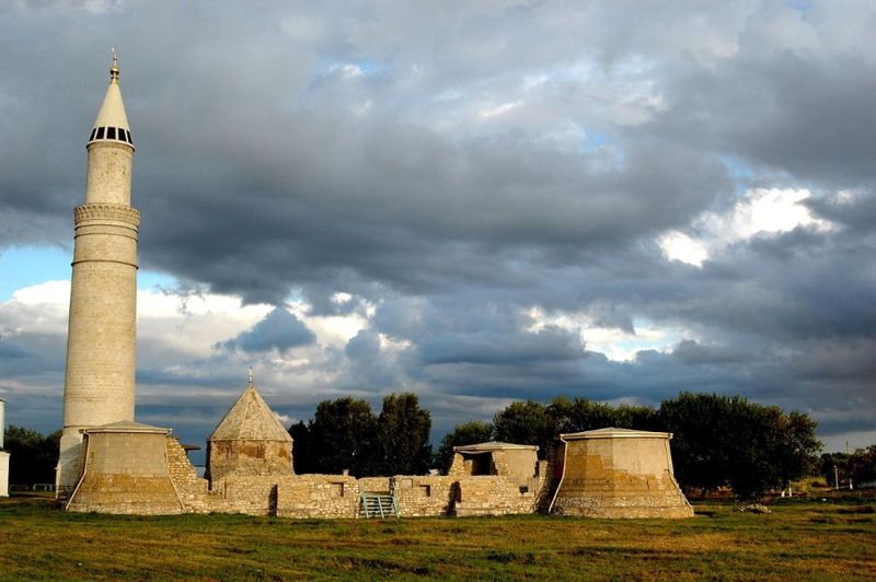 От памятника каменной архитектуры, не раз реконструировавшегося и датируемого серединой ХШ в., на сегодняшний день существуют лишь остатки четырех угловых башен, оснований стен и несколько архитектурных деталей с резной орнаментацией. Исследованию Соборной мечети посвящено довольно много работ (Башкиров, Смолин, Смирнов и др.), тем не менее описательные и графические реконструкции, которыми насыщены наши путеводители по булгарскому заповеднику, более чем относительны. Здание Соборной мечети имело довольно внушительный объем. Это было прямоугольное здание (32x34) с ипостильным (многоколонным) молельным залом то типу билярской мечети. В южной стене ее находился обращенный в сторону Мекки михраб (алтарная ниша) с богатой резной пластикой оформления. Внутренные опоры молельного зала первоначально имели, как показывают последние археологические исследования, квадратную в сечении форму и располагались по четыре столба в пять рядов, образуя как бы вытянутые коридоры — нефы. В последующих переделках мечети они были заменены восьмигранными колоннами, расположенными по сетке — шесть рядов по шесть опор. Первоначально по рядам колонн были, видимо, устроены аркады стрельчатого очертания по типу их в архитектуре стран Ближнего Востока.