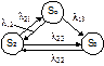 Предположим что нам известно λij для всех пар состояний Si, Sj если у стрелок на графе состояний интенсивность перехода, то это график состояния называется размеченным. Зная размеченный график состояния можно определить вероятность Рi(t) как функцию времени. Эти вероятности удовлетворяют уравнениями Колмогорова. Рассмотрим вывод уравнения Колмогорова на примере. Р1(t+Δt)=P1(t){1-[P12(Δt)+P13(Δt)]}+P2(t)P21(Δt) Р1(t+Δt)=P1(1){1-[λ12 Δt+ λ13Δt]}+P2(t) λ21 Δt. Раскрыв скобки в правой части и перенеся скобки в левую часть: dP1(t)/Δt=λ12P1(t)-λ13P1(t)+λ21 P2(t) Аналогично рассмотрим S2 и S3 запишем дифференциальное уравнения dP2(t)/dt=–λ21P2(t)–λ23P2(t)+λ12P1(t)+λ32P3(t) dP3(t)/ dt = - λ32P3(t) + λ13P1(t)+ λ23P2(t) Эти выражения для вероятности состояния называется уравнениями Колмогорова. Интегрирование системы уравнений дает искомые вероятности состояний как функций времени. Начальные условия. необходимое для интегрирования уравнений берется в зависимости от того, каким было начальное состояние системы s. Если в начальный момент времени система находится в состоянии s, то необходимо принять следующие условия при t=0. P1(t)=1, P2(t)=0, P3(t)=0 При решении следует учитывать, что все дифференциальный уравнения можно не записывать, так как для любого времени t справедливо условие. P1(t)+P2(t)+P3(t) =1 Правило построения дифференциального уравнения. В левой части каждого уравнения стоит производная вероятность состояния, а правая часть содержит столько членов, сколько стрелок, связано с данным состоянием. Если стрелки направлены из состояния, соответствий членов имеет знак «-»,если в состоянии то «+». Каждый член равен интенсивности перехода, соответствий данной стрелки, умноженное на вероятность того состояния, из которого выходит стрелка. Это правело, дает возможность записывать дифференциальные уравнения для вероятности непосредственно размеченному графику перехода. Следовательно обратить внимание не особенности связанные с возможной областью. Применения уравнений Колмогорова. Поэтому необходимо с понятием потока событий. Поток событие – последовательных однородных событий, следующих одно за другим в случайные моменты времени. Направление поток вызова на телефонную станцию, поток отказов в техническом устройстве. При рассмотрении процессов, протекающих в системе часто бывает удобно представить себе процесс так, как будто переходы системы из состояние в состояние происходит под действием поток событий. Поток событий обладает своими стационарностями (неизменности вероятных характеристик потока во времени, то есть вероятность появление n отказов в промежуток времени Δt зависит только от n, Δt и не зависит от положения промежутка Δt на оси времени.). Отсутствием после действия (события, образующие поток появляется в последовательные моменты времени, независимо друг о друга или когда вероятность наступления n отказов было как они распределятся до начала промежутка Δt). Ординарность – события происходящие По-одиночки, а не парами, называется простейшим потоком или стационарным Пуассоновским. Если все потоки событий, под действием которых система переходит из состояния в состояние простейшие, то случайная велечена – время пребывания системы в каждом из состояний распределяется по экспоненциальному закону. При этом случайный процесс, протекает в системе Марковский и он описывается дифференциальным уравнение Колмогор