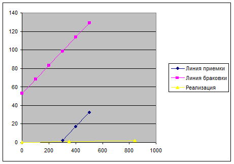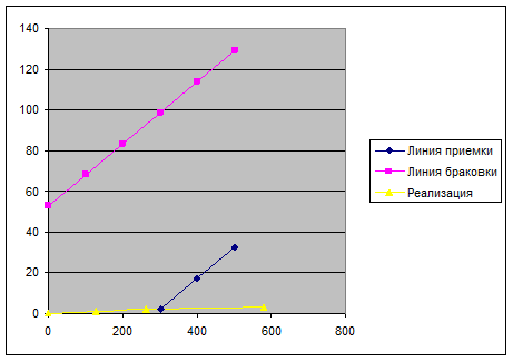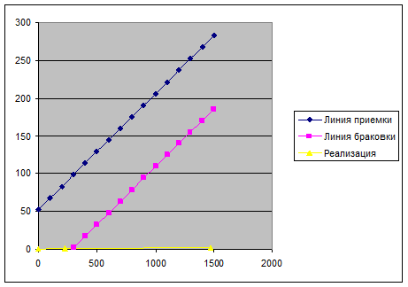 Рис. 6. Метод последовательного анализа (все реализации) Выводы: Т.к. график зависимости каждой из реализаций быстро входит в зону, отделенную на графике линией приемки, можно утверждать, что технологический процесс стабилен, а конструкция прибора – надежна.