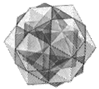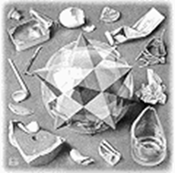 Правильные геометрические тела - многогранники - имели особое очарование для Эшера. Во его многих работах многогранники являются главной фигурой и в еще большем количестве работ они встречаются в качестве вспомогательных элементов. Существует лишь пять правильных многогранников, то есть таких тел, все грани которых состоят из однаковых правильных многоугольников. Они еще называются телами Платона. Это - тетраэдр, гранями которого являются четыре правильных треугольника, куб с шестью квадратными гранями, октаэдр, имеющий восемь треугольных граней, додекаэдр, гранями которого являются двенадцать правильных пятиугольников, и икосаэдр с двадцатью треугольными гранями. На гравюре "Четыре тела" (рис. 9) Эшер изобразил пересечение основных правильных многогранников, расположенных на одной оси симметрии, кроме этого многогранники выглядят полупрозрачными, и сквозь любой из них можно увидеть остальные. Большое количество различных многогранников может быть получено объединением правильных многогранников, а также превращением многогранника в звезду. Для преобразования многогранника в звезду необходимо заменить каждую его грань пирамидой, основанием которой является грань многогранника. Изящный пример звездчатого додекаэдра можно найти в работе "Порядок и хаос". В данном случае звездчатый многогранник помещен внутрь стеклянной сферы. Аскетичная красота этой конструкции контрастирует с беспорядочно разбросанным по столу мусором. Заметим также, что анализируя картину можно догадаться о природе источника света для всей композиции - это окно, которое отражается левой верхней части сферы.