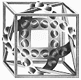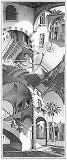 Эшер понимал, что геометрия определяет логику пространства, но и логика пространства определяет геометрию. Одна из наиболее часто используемый особенностей логики пространства - игра света и тени на выпуклых и вогнутых объектах. На литографии "Куб с полосками" (рис. 16) выступы на лентах являются визуальным ориентиром того, как расположены полоски в пространстве и как они переплетаются с кубом. И если вы верите своим глазам, то вы никогда не поверите тому, что нарисовано на этой картине. Еще один из аспектов логики пространства - перспектива. На рисунках, в которых присутствует эффект перспективы, выделяют так называемые точки исчезновения, которые сообщают глазу человека о бесконечности пространства. Вводя дополнительные точки исчезновения и немного изменяя элементы композиции для достижения нужного эффекта, Эшер смог изобразить картины, в которых изменяется ориентация элементов в зависимости от того, как зритель смотрит на картину. На картине "Cверху и cнизу" художник разместил сразу пять точек исчезновения - по углам картины и в центре. В результате, если мы смотрим на нижнюю часть картины, то создается впечатление, что мы смотрим вверх. Если же обратить взгляд на верхнюю половину картину, то кажется, что мы смотрим вниз. Чтобы подчеркнуть этот эффект, Эшер изобразил два вида одной и той же композиции.