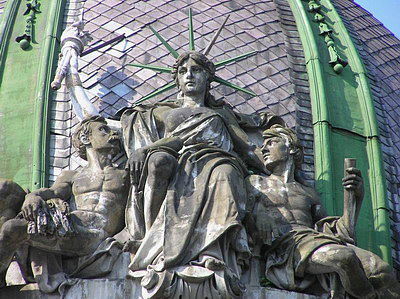 Алегорична скульптура, Музей етнографії Нац. академії наук України, Львів. 19. XX століття На початку XX століття в Європі виникає новий напрям в мистецтві, та, зокрема, в архітектурі — модерн. Архітектура модерну кожної країні набувала національних рис, і таким чином з'являється архітектура Українського модерну. Як відомо, на початку XX століття частини території України знаходились під впливом Російської і Австро-Угорської імперій, тому на цих територіях модерн, і в тому числі український модерн мав характерні особливості. Архітектура Західної України на початку XX ст. перебуває під впливом Віденського сецесіону, і набуває назви «сецесія». Поєднання народного мистецтва і сецесії стало наслідком виникнення Української сецесії, що має риси гуцульського і закопанського народного мистецтва. На території Центральної, Південної та Східної України, яка перебувала в складі Російської імперії, існує національний різновид модерну: «Український модерн», який виник в Полтаві. Найвідоміші споруди цього стилю були побудовані в Харкові, Полтаві, Києві, але керівництво імперії протидіяло розвитку української культури і, зокрема, національної архітектури. Це було однією з причин, які не сприяли розповсюдженню українського модерна. Таким чином найбільш широко на російської частині України було представлено російський варіант модерну, також в Україні існують зразки північної різновидності модерна (скандинавської). Інші народи, звичайно, привнесли в архітектуру України свої національні особливості, наприклад модернізовані неоготичний (Народи Європи) або неомавританський стилі (Східні народи). На території України за часів модерну творили такі постаті як академік Олексій Бекетов, Вікентій Прохаска, Григорій Артинов, Адам Генріх, Василь Кричевський, Тадеуш Обмінський, Іван Левинський. Вирізняється постать Владислава Городецького. Особливо завдячує Городецькому Київ, прикрашений неповторними будівлями в стилі модерну (будинок з химерами), неокласицизму (музей старожитностей і мистецтва, нині Національний художній музей), неоготики (Миколаївський костел, нині Національний будинок органної музики), мавританської архітектури (караїмська кенаса, нині Будинок актора). У 1910–1920 рр. отримав розповсюдження стиль необароко — спроба поєднати традиції високого «мазепинського бароко» із досягненнями європейського модерну. Після Соціалістичної революції у мірі на зміну епохи модерна приходить епоха Модернізму, яка в Радянської Україні представлена стилем Конструктивізму. Найбільш вражаючи споруди цієї доби були побудовані в Першої столиці Української республикі — Харкові (будинок Держпрому), Києві (Житлові будинки партапарату в районі «Липки», Перший будинок Лікаря). В 1932 р., з організацією єдиної Спілки архітекторів, було проголошено єдиний творчий метод — метод соціалістичного реалізму і тотальної орієнтації на класику. Конструктивізм піддали жорстокої критиці, багато архітекторів-конструктивістів було репресовано або страчено. Розпочинається активна політизація архітектурної діяльності та формування архітектури режиму з його пориваннями до гігантоманії та бутафорської помпезності форм, але архітектура сталінського історизму набула національних українських рис. В 1936–1939 рр. були збудовані: будинок ЦК КП(б)У, нині Міністерств