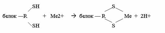 Связывание металла с тиоловыми группами белков приводит к разрушению структуры белка, что вызывает прекращение его функций. Результат - нарушение работы всех ферментных систем организма. Для нейтрализации тиоловых ядов применяются дитиоловые антидоты (доноры SH- групп). Механизм их действия представлен на схеме.