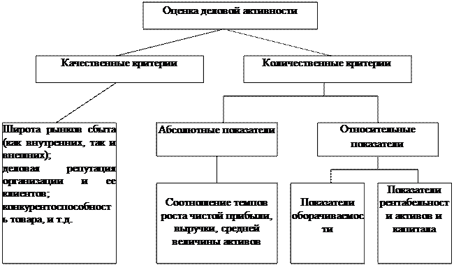 Деловая активность является комплексной и динамичной характеристикой предпринимательской деятельности и эффективности использования ресурсов. Уровни деловой активности конкретной организации отражают этапы ее жизнедеятельности (зарождение, развитие, подъем, спад, кризис, депрессия) и показывают степень адаптации к быстроменяющимся рыночным условиям, качество управления. Деловую активность можно охарактеризовать как мотивированный макро- и микроуровнем управления процесс устойчивой хозяйственной деятельности организаций, направленный на обеспечение ее положительной динамики, увеличение трудовой занятости и эффективное использование ресурсов в целях достижения рыночной конкурентоспособности. Деловая активность выражает эффективность использования материальных, трудовых, финансовых и других ресурсов по всем бизнес-линиям деятельности и характеризует качество управления, возможности экономического роста и достаточность капитала организации. Основополагающее влияние на деловую активность хозяйствующих субъектов оказывают макроэкономические факторы, под воздействием которых может формироваться либо благоприятный «предпринимательский климат», стимулирующий условия для активного поведения хозяйствующего субъекта, либо наоборот – предпосылки к свертыванию и затуханию деловой активности. Достаточно высокую значимость имеют также и факторы внутреннего характера, в принципе подконтрольные руководству организаций: совершенствование договорной работы, улучшения образования в области менеджмента, бизнеса и планирования, расширение возможностей получения информации в области маркетинга и др. Значение анализа деловой активности заключается в формировании экономически обоснованной оценки эффективности и интенсивности использования ресурсов организации и в выявлении резервов их повышения. В ходе анализа решаются следующие задачи: 1) изучение и оценка тенденции изменения показателей деловой активности; 2) исследование влияния основных факторов, обусловивших изменение показателей деловой активности и расчет величины их конкретного влияния; 3) обобщение результатов анализа, разработка конкретных мероприятий по вовлечению в оборот выявленных резервов. Деловая активность характеризуется качественными и количественными показателями. Качественными критериями являются: широта рынков сбыта (как внутренних, так и внешних), деловая репутация организации и ее клиентов, конкурентоспособность товара, и т.д. Количественная оценка даётся по двум на правлениям: 1) исследование динамики и соотношения темпов роста абсолютных показателей: основных оценочных показателей деятельности организации (выручка и прибыль) и средняя величина активов; 2) изучение значений и динамики относительных показателей, характеризующих уровень эффективности использования авансированных и потребленных ресурсов организации. При изучении сравнительной динамики абсолютных показателей деловой активности оценивается соответствие следующему оптимальному соотношению, получившему название «золотого правила экономики организации»: Трчп > ТрВ > ТрА > 100%, где Трчп – темп роста чистой прибыли; ТрВ – темп роста выручки от продаж; ТрА – темп роста средней величины активов.