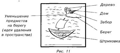 - 1 балл дается за специальное закрашивание или" штриховку какого-то предмета или части изображения (рисунок 9, 11), а также за штриховку (тень), если она несет смысловую нагрузку, то есть отражает объем или время суток; - 1 балл дается за цвет, если он дополняет основную идею ответа; - 1 балл начисляется за каждую вариацию изображения, если она несет в себе определенный смысл и дополняет основную идею ответа. Например, обследуемый может нарисовать предметы последовательно уменьшающимися или увеличивающимися в размерах, может просто нарисовать предмет большим или маленьким для того, чтобы передать идею пространства (рисунок 11);