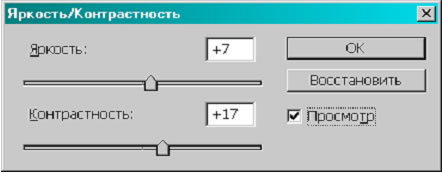 9 Виберіть пункт меню "Фільтр/Різкість/Різкість+". Як видно з зміненого малюнка контраст його покращилася. Для подальшого підвищення контрастності повторіть цю поперацию кілька разів. 10 Для підвищення яскравості використовуйте "Зображення/Корекція/ Яскравість/Контрастність". У діалоговому вікні (Рис.23) трохи підвищіть Яскравість і Контраст (приблизно в 2 рази більше яскравості).