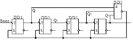 В исходном (нулевом) состоянии напряжение на выходах всех триггеров низкого уровня, а на выходе логического элемента DD5 и соответственно на входах R – высокого уровня, и триггеры могут работать, т.е. опрокидываться. Появление высокого уровня напряжения на выходе одного или двух триггеров в процессе счёта не отразится на состоянии логического элемента DD5, так как для изменения его состояния требуется высокий уровень напряжения на всех трёх его входах. Когда это произойдёт, напряжение на выходе DD5 упадёт, перебросит все триггеры в нулевое состояние и цикл счёта начнётся сначала. Логика работы схемы: первый триггер опрокидывается от каждого входного импульса, т.е.1=20, второй – от каждого второго импульса (2=21), третий – от четвёртых импульсов (4=22), а четвёртый триггер – от каждого восьмого импульса (8=23). Коэффициенту счёта Ксч=13=8+4+1=1*23+1*22+0*21+1*20 соответствуют, следовательно, состояния Q4=Q3=Q1=1, как и показано на функциональной схеме синтезированного счётчика. Аналогично можно синтезировать счётчики с коэффициентам счёта, например, 7, 11, 13, 14, 15.