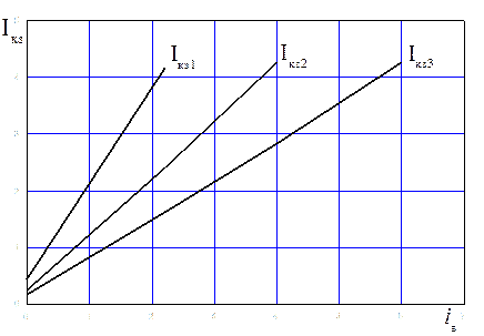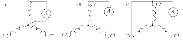 Рисунок 8 – Схемы соединений фазных обмоток для создания режимов одно– (а), двух– (б) и трёхфазного (в) короткого замыкания Для снятия характеристик необходимо плавно изменять величину тока возбуждения так, чтобы ток короткого замыкания в обмотке якоря изменялся от минимального до номинального значения. Результаты опытов записывают в таблицы, форма одной из которых приведена ниже (таблица 4). Примерный вид характеристик короткого замыкания показан на рисунке 9.