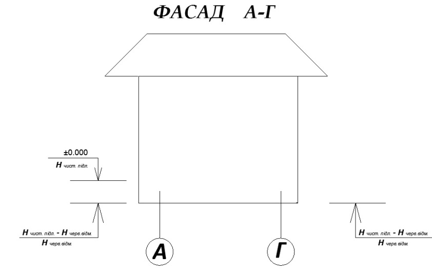 Відмітку чистої підлоги першого поверху записують у рамці на контурі будівлі (рис 1.1). Обчислені червоні відмітки та відмітки чистої підлоги першого поверху переносяться на фасад будинку.