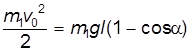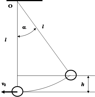 Механическая энергия шара складывается из кинетической К и потенциальной П и в любой точке траектории остается постоянной. В состоянии готовности шар 5, захваченный электромагнитом, поднят на некоторую высоту h по отношению к исходному положению (рис. 2). Шар массой m 1 обладает потенциальной энергией, рассчитываемой по формуле П = m 1 gh. (8) Рис. 2 Высота h связана с длиной l нити и углом a ее отклонения от вертикали соотношением h = l (1 – cosa). (9) Под действием силы тяжести шар 5 будет опускаться вниз, двигаясь по дуге окружности радиусом l. При этом его потенциальная энергия уменьшается, а кинетическая – растет. Кинетическая энергия шара