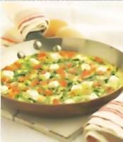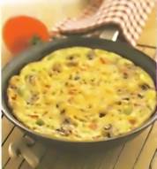 | | Помойте овощи, очистите их, порежьте. Разогрейте на сковороде масло и высыпьте в нее овощи. Готовьте овощи, постоянно помешивая, пока они немного не размякнут. Яйца смешайте с молоком и специями и вылейте полученную массу на сковороду. Готовьте на слабом или умеренном огне. Украсьте блюдо, посыпав его сверху тертым сыром. Подавайте с картофелем или хлебом.