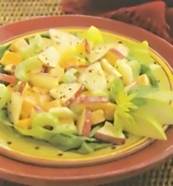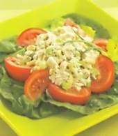| | Слейте с рыбы рассол и разделите ее вилкой на отдельные куски. Помойте и порежьте листья салата. Помойте и нарежьте кубиками сельдерей, редиску, люцерну. Разложите листья салат ан тарелке и выложите сверху на них ростки люцерны. Смешайте мясо тунца с нарезанным сельдереем и редиской, заправьте майонезом, горчицей, лимонным соком и посыпьте специями. Выложите сверху на салат вместе с белым сыром и подавайте как гарнир. Подавайте с рогаликом или багетом.