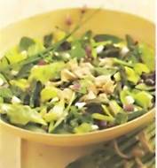 | | Слейте с рыбы рассол и разделите на отдельные куски вилкой. Посеките сваренное яйцо. Помойте листья салата и порвите его кусками на один укус. Помойте и нарежьте кубиками сельдерей и лук. Нарежьте ростки спаржи мелкими кусками. Разложите листья салата и овощи в тарелке. Сверху выложите кусочки рыбы и посеченное яйцо. Смешайте йогурт со специями и сбрызните этой смесью салат. Подавайте с хлебным рогаликом или багетом.