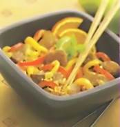 | | Очистите луковицу и нарежьте дольками. Помойте перец, очистите его от зерен и нарежьте дольками. Нарежьте свиную вырезку ломтиками. Разогрейте масло и пожарьте свинину несколько минут на слабом огне вместе с раздавленным зубком чеснока и дольками лука. Добавьте нарезанный перец. Смешайте апельсиновый сок и сок лайма с соусом чили, порошком кари и другими специями. Вылейте полученную смесь на сковороду и размешайте. Готовьте на слабом огне в течение 30 минут, пока свинина не станет нежной. Прибавьте огонь и готовьте еще 5 минут, пока не испарится жидкость. Подавайте с рисом, картофелей или пастой.