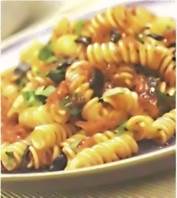 | | Приготовьте пасту таким образом, чтобы она оставалась упругой и немного твердоватой, слейте воду, отставьте в сторону. Помойте помидоры и разрежьте на 4 части. Очистите лук и нарежьте дольками. Удалите косточки из оливок и порежьте их на мелкие кусочки. Мелко посеките чеснок и слегка поджарьте его в масле вместе с дольками лука, пока он не станет прозрачным. Добавьте оливки, помидоры, томатную пасту, петрушку, лавровый лист, специи и готовьте несколько минут на слабом огне. Выложите на сковороду уже приготовленную пасту. Посыпьте ее тертым пармезаном и пассируйте, пока паста не разогреется, а сыр не размякнет.