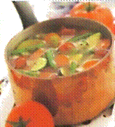 | | Помойте овощи, очистите их, нарежьте маленькими кубиками. Выложите овощи в сковородку, залейте куриным бульоном, добавьте чесночный порошок и специи. Доведите до кипения и готовьте в течение 15-20 минут, пока овощи не станут мягкими, а суп не загустеет. Подавайте с рогаликом или багетом.