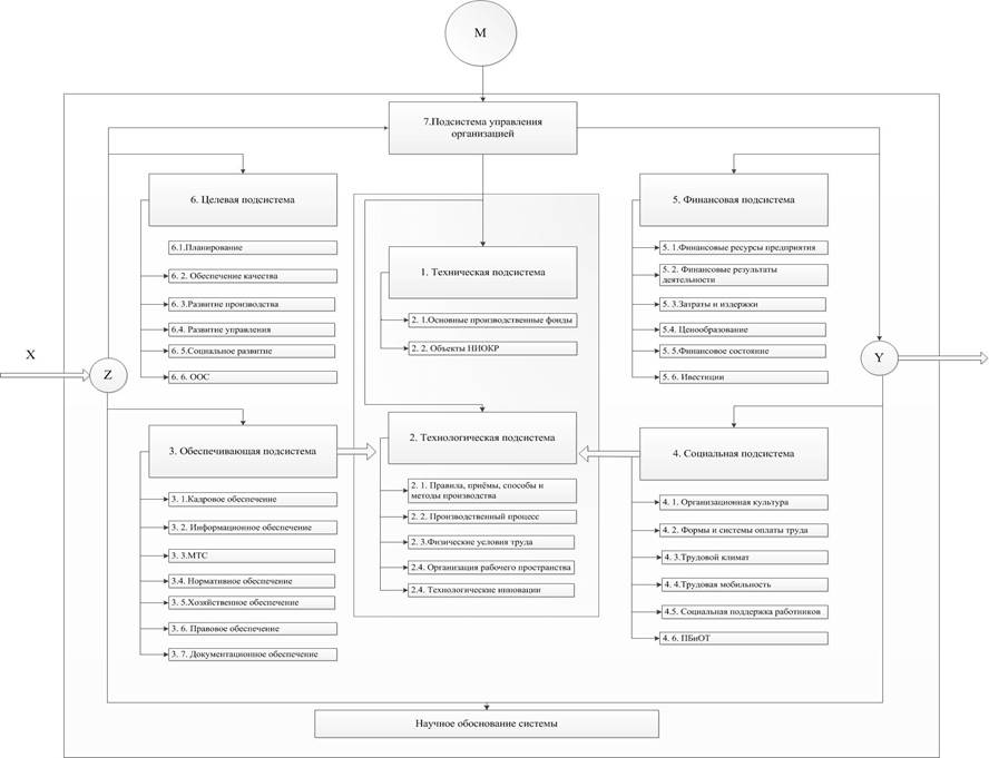 Рис.2.Алгоритм действия системы. Представим далее модель организации как социотехнической системы. Важнейшим понятием, используемым при построении сложных систем, является обратная связь, которая определяется как воздействие результатов функционирования системы на характер этого функционирования. Если обратная связь усиливает результаты функционирования, то она называется положительной, если ослабляет – отрицательной [2,с.15-16]. Любая системная функциональная единица включает в себя как минимум следующие элементы (рис.3): 1. Фильтр (Z). Выделяет требуемые сигналы внешней среды. 2. Афферентные пути, которые передают информацию с фильтра на анализатор. 3. Анализатор (подсистема управления). На основании информации с фильтра вырабатывает решения об активации исполнительных элементов. 4. Эфферентные пути. Передают управляющие воздействия на исполнительные элементы. 5. Уставка (М). Выдаёт разрешение на действие системы при определённых внешних воздействиях. По отношению к предприятию уставку определяют органы государственной власти, общее собрание акционеров и т.д. Она указывает на связь системы и внешней среды Организация (предприятие) [2] как сложная система является синтезом следующих подсистем (рис.3): 1. Технической, которая включает оборудование, инструменты и прочие средства труда, преобразующие вход в выход, способом который улучшает экономическую эффективность организации. 2. Технологической. Под технологией в наиболее широком смысле мы будем понимать практическое применение научных и профессиональных знаний выраженное в форме: а) правил, приёмов, способов и методов производства, обработки и переработки сырья и материалов. б) использования необходимых специализированных или универсальных средств производства: машин, механизмов, устройств и систем. На промышленных предприятиях объединение технической и технологической подсистем формируют его производственную систему. 3. Обеспечивающей. Данная подсистема обеспечивает деятельность организации необходимыми ресурсами: трудовыми, капитальными, информационными и т.д. 4. Социальной, которая включает занятых в организации служащих (знания, умения, настрой, ценностные установки, отношение к выполняемым функциям), управленческую структуру, систему мотивации поощрений и социальной поддержки. 5. Финансовой, направленной на поиск источников формирования имущества предприятия и поддержание основных показателей его деятельности на заданном уровне. 6. Целевой подсистемы обеспечивающей достижение всех поставленных краткосрочных и долгосрочных целей по основным видам деятельности организации, включая планирование и управление развитием. 7. Подсистемы управления организацией (блока управления). 8. Подсистемы внешней среды, включающей социальные ценности, социальные и государственные институты с которыми взаимодействует организация, другие организации выступающие конкурентами или находящиеся в других отношениях. Следует отметить, что при изучении тех или иных подсистем необходимо учитывать их взаимодействие в рамках системы как целого. В зависимости от вида экономической деятельности организации, состав и структура подсистем организации может серьёзно различаться. Однако системный подход позволяет смоделировать процесс функционирования фактически любой органи
