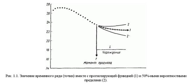Функция В дополнение к вычислению наилучшего прогноза необходимо также указать его точность, чтобы, например, можно было оценить риск, связанный с решениями, основанными на прогнозировании. Точность прогноза может быть выражена вероятностными пределами по обе стороны от каждого прогнозируемого значения, Эти пределы можно вычислить для любого удобного набора вероятностей, например для 50 и 90%. Смысл этих пределов в том, что значения временного ряда, которое появится в соответствующее время, с указанной вероятностью будет лежать внутри этих пределов. Для иллюстрации на рис. 1.1. показаны 20 последних значений временного ряда, обрывающегося на времени t. Там же показаны прогнозируемые величины на момент t для упреждений l=1,2,…,13 вместе с 50%-ными вероятностными пределами.
