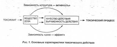 Токсичность проявляется и может быть изучена только в процессе взаимодействия химического вещества и биологической системы (клетки, изолированного органа, организма, популяции). Формирование и развитие реакций биосистемы на действие токсиканта, приводящих к ее повреждению (т. е. нарушению ее функций, жизнеспособности) или гибели, называется токсическим процессом. Механизмы формирования и развития токсического процесса, его качественные и количественные характеристики, прежде всего, определяются строением вещества и его действующей дозой (рис. 1).
