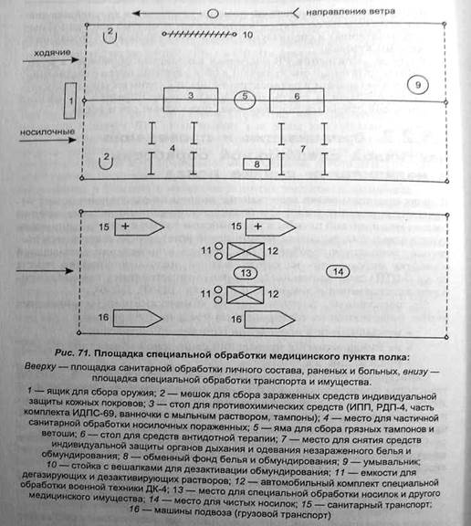 Оказание первой врачебной помощи пораженным включает проведение частичной санитарной обработки пораженных, зараженных РВ свыше допустимых степеней, а также зараженных стойкими ОВ. Для этого на медицинской роте полка развертывается площадка специальной обработки (рис. 43). ПСО должна находиться на некотором удалении от сортировочного поста (20-30 м), обязательно с подветренной стороны медицинской роты полка, в летнее время на открытом воздухе, а при неблагоприятных условиях погоды и зимой для развертывания ее нужно иметь минимум две приспособленные лагерные палатки или навес. На этой площадке работают санинструктор и 4-5 санитаров из числа легкораненых. ПСО должна быть приспособлена для совместной обработки людей, зараженных РВ и ОВ. Схема развертывания и организации работы ПСО может варьировать в зависимости от условий и вида заражения. Всегда необходимо предусмотреть обработку легкопораженных и носилочных больных. На ПСО должно быть место для дезактивации обмундирования и других предметов и место для санитарной обработки раненых и пораженных. Оснащение для ПСО: ИПП, ДПС, вешалка для дезактивации, щетки, веники, палки для выбивания пыли из одежды, поильники, умывальник, тазики, салфетки, полотенца, ведра, резиновый баллончик для промывания глаз, вещества для приготовления 0,3% раствора СФ-2, 5% раствора хлорамина, мешки для зараженного обмундирования, шпагат для обозначения грязной и чистой половин. Эти предметы целесообразно уложить в ящик, на крышке которого написать "ПСО". Кроме того надо иметь комплект В-5 (дезинфекция), гидропульт, подставки для носилок, скамейку, столики, бачок для чистой воды.