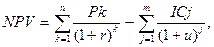 Якщо NPV > 0, значить поточна вартість доходів перевищує поточну вартість витрат і проект слід прийняти; при NPV < 0 – проект слід відхилити, тому що він не принесе підприємству дохід на вкладений капітал; при NPV = 0 – проект ні прибутковий, ні збитковий. При прогнозуванні доходів по роках необхідно по можливості враховувати всі види надходжень як виробничого, так і невиробничого характеру, що можуть бути асоційовані з даним проектом. Так, якщо по закінченні періоду реалізації проекту планується надходження коштів в вигляді ліквідаційної вартості обладнання або вивільнення частини оборотних коштів, вони повинні бути враховані як доходи відповідних періодів. Якщо проект припускає не разову інвестицію, а послідовне інвестування фінансових ресурсів протягом т років, то формула для розрахунку NPV модифікується таким чином: