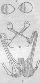 Рис. 2. Схема строения зрительного анализатора: 1 — поля зрения; 2 — наружные коленчатые тела; 3 — зрительная кора.