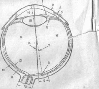 Рис. 3. Строение глаза 1 — радужная оболочка; 2 —• роговица; 3 — конъюктива; 4 — ресничная мышца; 5 — цинновы связки; 6 — стекловидное тело; 7 — зрительная ось; 8 — центральная ямка; 9 — желтое пятно; 10 — зрительный нерв; 11 — сосудистая оболочка; 12 — склера; 13 —сетчатка; 14 — оптическая ось; 15 — хрусталик 16 •—передняя камера. Подобно тому как в фотоаппарате получается изображение на светочувствительной пленке, в глазу на так называемой сетчатой оболочке формируются изображения рассматриваемых предметов.