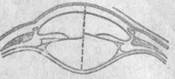 Рис. 4. Механизм аккомодации. Левая половина рисунка изображает хрусталик при рассматривании удаленного предмета, правая — при рассматривании близкого предмета, при этом увеличивается выпуклость хрусталика.
