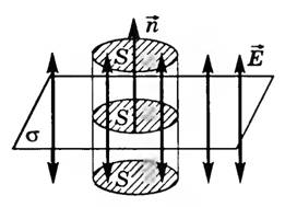 Рис. 4 В качестве поверхности площадью S выберем цилиндрическую поверхность, образующая которой перпендикулярна плоскости. Основания этого цилиндра расположены перпендикулярно линиям напряженности по обе стороны от плоскости. Так как образующие цилиндра параллельны линиям напряженности (α = 90°, cos α = 0), то поток через боковую поверхность цилиндра отсутствует, и полный поток через поверхность цилиндра равен сумме потоков через два основания: N = 2 ES. Внутри цилиндра заключен заряд q = σS, поэтому, согласно теореме Остроградского-Гаусса,