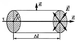 Заряд, находящийся внутри этого цилиндра, q = τ · Δ l. Согласно теореме Остроградского—Гаусса, можно записать