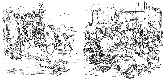 Только тут, блеснув золотом, стрела упала с неба и воткнулась в помост, как молния, схваченная на лету. Говорят, что в драке семеро лучше пяти и пятеро лучше трёх, и это, конечно, верно. Стрелков было четыре десятка, а шерифовой стражи – сто человек. Но кольчуга крепче линкольнского сукна, датский топор тяжелее дубины, вот почему очень скоро люди шерифа железной стеной окружили своего господина и стали теснить лесных молодцов. – Веселей, веселей, ребята! – покрикивал Робин Гуд. – Не жалейте колпаков и кольчуг! – Ко мне! – раздался голос Скателока из‑под кучи тел. – Клянусь крестом, я поймал их начальника! Отец Тук, бросив дубину, навалился грудью на стражников, подмявших под себя Скателока. Начальник стражников, вывернувшись из рук стрелка, взмахнул ножом над широкой спиной монаха, но опрокинулся навзничь, пробитый стрелой. Робин Гуд, спешивший на выручку Скателоку и Туку, обернулся, дивясь, откуда прилетела стрела. На перекладине виселицы сидели двое: тощий лучник в лисьей шапке и шерифов стрелок, состязавшийся с Робином на стрельбище. Оба, с луками в руках, спокойно смотрели сверху на свалку, выбирая мишени. – Эге! И ты тут! Учишься бить навскидку, приятель? – рассмеялся Робин и едва успел отскочить в сторону из под сверкнувшего над его головой топора. Он ответил врагу ударом ножа; клинок скользнул по кольчуге, но стражник упал, сшибленный с ног тяжёлым кулаком. Из городских ворот вырвался конный отряд; шпоря лошадей, всадники скакали на помощь шерифу. Тогда звучный рог Робина покрыл шум схватки. – К лесу, ребята! – крикнул Робин. И его молодцы, как подхваченные ветром зелёные листья, запрыгали и понеслись по дороге. Толпа горожан, собравшаяся вокруг виселиц, чтобы посмотреть, как повесят сыновей вдовы, давно растаяла. Только кучка крестьян из‑за поворота дороги следила за ходом битвы. Теперь пришло время для стрел. Тот, кто раньше других успел выбраться из свалки, натягивал лук в ожидании товарищей. – Стойте, Маленький Джон остался! – Он ранен, Робин! – Бейте по лошадям! – скомандовал Робин, надеясь задержать верховых. Вместе с Муком и сыновьями вдовы он повернул назад и, подхватив с земли чей‑то меч, врезался в толпу стражников. Маленький Джон отбивался от наседавших на него врагов, стоя на одном колене; из другого колена у него хлестала кровь. Тощий лучник и шерифов стрелок принимали на себя направленные против него удары, и вся ярость стражников обрушивалась на изменившего шерифу воина. – Не робей, Джон, держись! – крикнул Мук. Робин, прорвав кольцо нападавших, с такой силой ударил мечом одного из стражников, что тот, покатившись, сбил с ног другого. Мук помог младшему сыну вдовы взвалить на плечи Маленького Джона. Тощий лучник, Робин и шерифов стрелок загородили товарищей и так, отбиваясь, пятились до самой дороги. Между тем всадники, стройная колонна которых рассылалась под первым роем стрел, совладали с прянувшими в сторону лошадьми и во весь опор понеслись на стрелков. Четверо всадников отделились от колонны и поскакали наперерез Робину и Муку. – Бегите! – крикнул Робин товарищам. – Спасайте Джона, я справлюсь с ними сам. Тощий лучник, Мук и сын вдовы с Джоном на плечах пустились вперёд по дороге к лесным молодцам. Но шерифов стрелок ослушался приказания. Он остался рядом с Робином, и сразу два лука послали в неприятеля смертельн