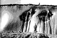 Рис.1.Крупные ледяные жилы в вечномерзлых породах.Хребет Кулар, Северная Якутия Оттаивание льдонасыщенных пород будет сопровождаться просадками земной поверхности и развитием опасных мерзлотных (криогенных) геологических процессов: термокарста, термоэрозии, солифлюкции и др. Целые регионы с низкими абсолютными отметками поверхности окажутся затопленными морем. Возникнет угроза разрушения зданий и инженерных сооружений, возведенных с сохранением мерзлого основания. Такие последствия потепления климата станут разорительными для экономики. Мерзлотоведы в состоянии количественно оценить грядущие изменения вечной мерзлоты на любой срок времени и предотвратить многие вредные их последствия, свести к минимуму затраты на стабилизацию мерзлотной обстановки, но только в том случае, если достоверно известны исходные климатические параметры. Загвоздка в том, что климатические прогнозы еще далеки от совершенства, что объясняется сложной природой изменений погоды и климата. Климат постоянно претерпевает естественные изменения. В 1625 г. сэр Фрэнсис Бэкон обратил внимание на то, что кроме суточных и сезонных изменений метеорологических элементов имеются еще многочисленные многолетние циклы их изменения. В 1957 г. Дж.К.Чарлсуэрт уже насчитывал около 150 циклов колебаний климата различной продолжительности. А.С.Монин и Ю.А.Шишков выделяют миллиардолетние циклы, циклы продолжительностью в сотни и десятки миллионов лет и более мелкие (в историко-геологическом понимании) колебания с периодом от десятков тысяч до десятков лет. Хорошо известны короткопериодные колебания метеорологических элементов: 9-14-летние, 5-6-летние и др. Все разнопериодные циклы изменения климата и погоды накладываются друг на друга и создают сложный интегральный ход изменения метеорологических элементов. В последние два-три десятилетия на естественные климатические циклы все заметнее стали накладываться направленные изменения, связанные с техногенезом. К сожалению, достоверность и оправдываемость долгосрочных метеорологических прогнозов пока оставляют желать много лучшего. В итоге результаты прогнозов климата получаются разноречивыми, что, в свою очередь, вызывает неоднозначность в мерзлотных прогнозах. Различаются сценарии значительного потепления климата области вечной мерзлоты в XXI веке (М.И.Будыко, О.А.Анисимов, М.К.Гаврилова, Ф.Э.Нельсон) и умеренного потепления (Е.П.Борисенков, А.В.Павлов), имеется даже сценарий похолодания (Н.А.Шполянская). Сценарии значительного потепления климата распространяются на территорию вечной мерзлоты лишь с учетом самых общих ее свойств. По М.К.Гавриловой, к середине грядущего столетия среднегодовая температура воздуха в Сибири и на Дальнем Востоке повысится на 4-10 градусов Цельсия, вследствие чего вечная мерзлота будет оттаивать и со временем сохранится только в высоких горах и на равнинах севера Восточной Сибири и Дальнего Востока. О.А.Анисимов и Ф.Э.Нельсон считают, что увеличение глобальной температуры воздуха на 2 градуса Цельсия приведет к полному оттаиванию мерзлых пород на 15-20 % территории криолитозоны. Метеорологические данные за последние 10-15 лет показывают, что экстремальные сценарии изменения климата не оправдываются, потепление идет, но более скромными темпами. При обосновании сценариев умеренного 