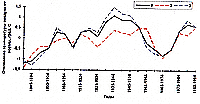 Рис. 2. Отклонение средних скользящих 10-летних значений среднегодовой (1), среднелетней (2) и среднезимней (3) температур воздуха от нормы в Салехарде (север Западной Сибири) Темп повышений среднегодовой температуры воздуха за последние 25-30 лет составляет 0,02-0,03 градуса Цельсия в год в условиях Европейского Севера, 0,03-0,07 - на севере Западной Сибири и 0,01-0,08 градуса Цельсия в год - в Якутии. Само повышение температуры воздуха за этот период изменяется от 0,4 до 1,8 градуса Цельсия. Потепление климата обусловлено главным образом повышением зимней температуры воздуха. Если тенденция к климатическому потеплению сохранится в первой половине XXI века, можно ожидать повышение среднегодовой температуры воздуха к 2020 году на 0,9-1,5 градуса Цельсия и к 2050 году на 2,5-3 градуса Цельсия. Атмосферные осадки к этим же годам возрастут на 5 и 10-15 %, соответственно. Анализ данных мониторинговых наблюдений и геотермических исследований свидетельствует о широко распространенной деградации верхних горизонтов криолитозоны (повышение температуры вечномерзлых пород, уменьшение их площади, возрастание глубины сезонного протаивания) за последние 15-25 лет. Повышение температуры мерзлоты может быть вызвано как потеплением климата, так и возрастанием снегоотложений.