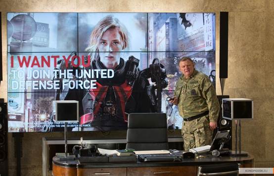 Однако в какой-то момент Кейджа призывают в Лондон под светлые очи руководителя всей операции против пришельцев - генерала Бригхэма (Брендан Глисон), который говорит, что Кейдж завтра должен быть на передовой в Нормандии - там планируется решающее сражение. Кейдж категорически отказывается - ну какой из него боец, - и даже пытается шантажировать генерала своими пиаровскими возможностями, но генерал на такую дешевку не покупается: Кейджа быстро успокаивают электрошокером, и он приходит в себя на военной базе в Хитроу.