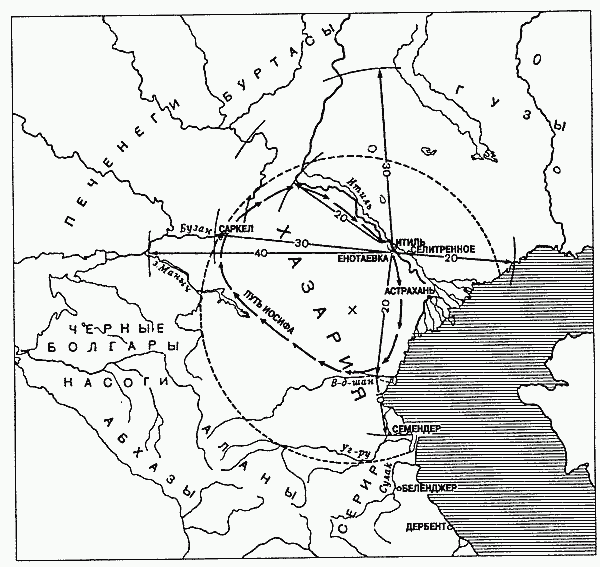 В один из весенних дней 1959 г. я вошел в читальный зал библиотеки Эрмитажа и увидел профессора М. И. Артамонова, рассматривающего карту калмыцких степей. «Сколько километров в фарсахе?» – мрачно спросил он меня. Я припомнил общепринятую величину – 5,5 км, но профессор буркнул: «Не выходит» – и пригласил меня к карте. Дело заключалось в следующем. Хазарский царь Иосиф в письме к Хасдаи ибн Шафруту описал ежегодную летнюю перекочевку своего двора. Весной он выезжал из своей столицы Итиль, расположенной на берегу Волги, и двигался на юг к реке В‑д‑шан. Затем он перекочевывал на север, очевидно избегая летней жары в засушливых прикаспийских районах, но двигался не домой, а к реке Бузан, отождествляемой с Доном, и оттуда возвращался к себе в Итиль, находившийся в 20 фарсахах от Бузана [50, с. 103][2]. Тут же царь Иосиф сообщает расстояния от своей столицы до границ своего царства: на восток до Гирканского, т. е. Каспийского, моря – 20 фарсахов, на юг до реки Уг‑ру – 30 фарсахов и на север до уже упомянутой реки Бузан и «до склона нашей реки к морю Гирканскому», т. е. до сближения излучин Дона и Волги в современном месте Волго‑Донского канала, – 20 фарсахов. Таким образом, все расстояния исчисляются от столицы Итиля. Следовательно, для того чтобы найти место столицы, М. И. Артамонов построил на карте треугольник, упиравшийся вершинами в реки Дон (Бузан), Волгу (Итиль) и Терек (Уг‑ру), с длиной сторон, пропорциональной заданным расстояниям. Однако установленная длина фарсаха – 5,5 км противоречила его построению. Если принять эту длину за основу и опереть вершины треугольника на Дон и пусть даже не на Терек, а на Куму и Маныч, то столица Хазарского каганата должна оказаться в степи Северной Калмыкии, около Сарпинских озер. Это одно противоречило источникам, помещавшим Итиль на берегу Волги, а кроме того, пропадала большая река В‑д‑шан, находившаяся на 10 фарсахов севернее пограничной реки Уг‑ру [72, с. 141–145. Ср.: 7, с. 385–390]. Задача казалась неразрешимой, и именно это заставило моего учителя задуматься.