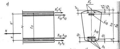 20) Расчет растянутых железобетонных элементов. Общие положения. Центрально растянутые элементы. Расчет растянутых железобетонных элементов: При работе центрально-растянутых элементов под нагрузкой различают три характерные стадии напряженно-деформированного состояния: стадию I — до образования трещин, стадию II—после образования трещин, стадию III — разрушение. С увеличением внешней нагрузки напряжения в бетоне и арматуре возрастают. Когда напряжения в бетоне достигнут временного сопротивления растяжению: в элементе образуются трещины (стадия Iа). При образовании трещин деформации арматуры ea в силу сцепления равны предельным деформациям бетона, поскольку оба материала деформировались совместно. По мере дальнейшего возрастания внешней нагрузки увеличиваются напряжения в арматуре, а трещины в бетоне раскрываются все больше. Когда напряжения в арматуре достигнут значения предельных напряжений (предела текучести для мягкой стали или временного сопротивления для твердой стали), наступит разрушение элемента (стадия III). Прочность элемента будет обеспечена, если расчетная продольная сила N (усилие в элементе от расчетных нагрузок) не будет превышать усилия, воспринимаемого арматурой при напряжениях в ней, равных расчетному сопротивлению Ra. Из условия прочности определяют требуемую площадь сечения продольной растянутой арматуры. В центрально-растянутых элементах без предварительного напряжения кроме проверки прочности по стадии III необходимо определить ширину раскрытия трещин по стадии II. Площадь сечения арматуры определим из условия прочности. Теперь рассчитаем ширину раскрытия трещин. Напряжения в арматуре по сечению с трещиной; от длительной нагрузки от кратковременной нагрузки коэффициент армирования; d=14мм; h=1; Сд равно: при кратковременной нагрузке 1, при длительной нагрузке 1,5. Ширина раскрытия трещин от длительной нагрузки по формуле при k=l,2 равна = Приращение ширины раскрытия трещин от кратковременной нагрузки: =0,07 мм; 1. Центрально растянутые элементы – армируются отдельными стержнями элементы с равномерным распределением рабочей арматуры по сечению. Диаметр рабочей арматуры принимается от 3 до 32 мм предпочтение отдается наименьшему диаметру при большем кол-ве стержней для повышения трещиностойкости. Армирование внецентренно раст. элементов производится аналогично изгибаемым элементам с двойной арматурой, т.е. большее кол-во стержней и больший диаметр ставится в растянутой зоне бетона. Расчет центрально растянутых N<Nult – предельое значение прод. раст. силы. Nult=RsActot – площадь сечения всей продольной арматуры Расчет внецентренно-растянутых элементов подразделяется на два случая: 1. Случай малых эксцентриситетов