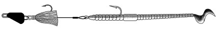 Рис. 27. Тандем: мушка плюс пластиковый червь Каждая из приманок тандема Fly Worm оснащена высококачественным крючком № 4/0 фирмы Gamakatsu. По аналогии с этой оснасткой вы можете создавать свои, не менее уловистые тандемы. Подбирая сочетания приманок, необходимо учитывать не только собственные вкусы, но, прежде всего, «заинтересованность» хищника, на которого вы собираетесь охотиться. Если вы обладаете определенной долей фантазии, простор для экспериментов широк, однако в самоцель превращать увлекательное занятие не стоит. Для начала можно ограничиться стандартными наборами: колебалка + вращалка, вращалка + твистер, виброхвост + мухоблесна и т. д. Наиболее распространенный вариант, когда основная, более тяжелая, приманка служит для обеспечения дальнего заброса. Если хищная рыба стоит вдали от берега – это оптимальный случай. При ловле с лодки вы можете обходиться забросами на расстояние 20–30 м. В данной ситуации выбор тандемных приманок более широк. Скажем, вполне результативно можно использовать две легкие приманки, которые у хищника также вызывают чувство соперничества. Это могут быть как искусственные, так и натуральные приманки либо их комбинации (рис. 28).
