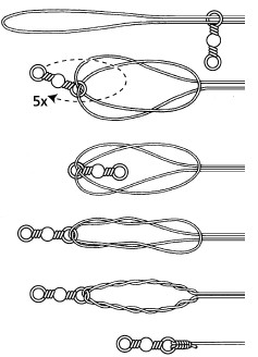 Рис. 33. Присоединение плетеной лески к вертлюжку или приманке безузловым способом Многие катушки не имеют на шпуле указаний по лесоемкости для мононитей диаметром 0,120,14 мм. Это значит, что такие лески чаще всего приходится наматывать на шпулю, частично заполненную старой леской или прокладкой из пористой резины. После намотки леска должна не доходить до краев бортиков шпули на 2–3 мм. При ловле на тонкие лески некоторые рыболовы предпочитают пользоваться короткими мягкими удилищами. Однако если учесть, что в большинстве случаев не последнюю роль играют дальность заброса и способность хлыста обеспечить необходимую амортизацию при рывках рыбы, то выбирать все‑таки надо удилища подлиннее. Наиболее приемлемой и работоспособной, пожалуй, будет модель типа Ultra‑light длиной 2,4–2,7 м. В ассортименте сверхлегких удилищ, выпускаемых многими компаниями, имеется широкий спектр подобных моделей. При этом штекерное удилище имеет явные преимущества перед телескопическим, так как в первом случае нагрузка при вываживании рыбы распределяется по всему хлысту более равномерно. Вообще, строго говоря, секрет подходящего удилища для столь деликатной ловли заключается в его способности плавно распределять нагрузку от вершинки до комля. Об этом вы не должны забывать при выборе снасти, равно как и о том, что техника ловли на тонкие лески также должна быть соответствующей. В этой части имеется много особенностей, без знания которых невозможно добиться хороших результатов. Прежде всего необходимо избавиться от рефлекторных действий при подсечке рыбы. Если вы махнете удилищем, словно собираетесь забросить трофей сразу на сковородку, то рискуете оборвать тонкую леску. Вместо этого позвольте рыбе самой подсечь себя. Уверяю вас, она сделает это более тактично. Единственное условие – использование крючков с тщательно заточенными жалами, которые способны легко проникнуть в ткани пасти рыбы. Если вы сможете выдержать первые несколько секунд борьбы, гася попытки рыбы к бегству, у вас есть хороший шанс выйти победителем в захватывающем поединке. И наоборот, форсируя вываживание в надежде, что жертва вот‑вот уступит, рыболов, как правило, обречен на поражение. Принцип здесь один: легкую снасть вы должны использовать с наибольшей эффективностью, но быть при этом предельно внимательным. Конечно, изящное удилище и леска с разрывной нагрузкой до 2 кг не могут противостоять сильным потяжкам и внезапным рывкам крупной рыбы. Это всегда чревато потерей трофея. В таких ситуациях лучше применять спокойную манеру «работы» с рыбой. Если она не хочет сдвинуться с места после подсечки, вряд ли следует спешить. Не будем забывать, что рыба особенно начинает паниковать, когда мы доставляем ей боль. Разумнее дать жертве свободно погулять, в это время она будет постепенно выбиваться из сил. Есть рыбы более выносливые, есть – менее. Это обязательно нужно учитывать при аккуратном вываживании. В том случае, когда рыба идет в глубину, постарайтесь изменить направление ее хода, скажем, вправо. Если это удастся и она пойдет вправо, переведите удилище в противоположную сторону и попытайтесь вновь изменить ее маршрут. Иногда подобные движения рыбы с приманкой в пасти напоминают ход парусной шлюпки, идущей галсами под ветром. В процессе вышеописанных маневров фрикционный торм