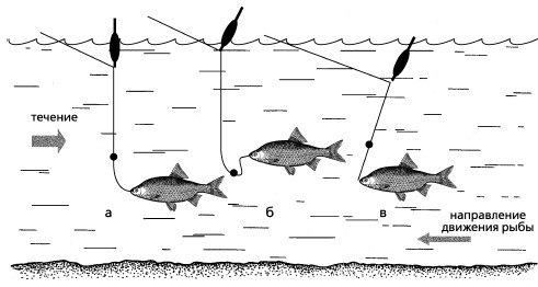 Этот способ ловли рыболовы‑поплавочники применяют издавна как наиболее добычливый, особенно весной, когда рыба перед нерестом идет вверх по рекам. Ловить впроводку можно с берега, с лодки, мостов и мостков, пристаней, а также в забродку. Удят на участках реки, где есть хотя бы слабое течение. При незначительной ширине реки можно вполне обойтись поплавочной удочкой с «глухой» оснасткой. Перемещаясь по берегу, вверх или вниз по течению (второй вариант предпочтительнее), рыболов тщательно обследует омутки, спокойные затишные места. Пробует ловить на границе быстрого и медленного течений. При этом следует учитывать, что скорость течения в различных слоях речного потока неодинакова: наибольшая у поверхности, а наименьшая у дна. На приглянувшемся участке неплохо для начала обследовать характер донного грунта: наличие неровностей, уступов, канав, препятствий. С этой целью перед ловлей достаточно снять поводок с крючком и сделать несколько пробных забросов. Если ваша оснастка огружена правильно, она выдаст вам полную информацию, и вы легко сможете определить оптимальную зону проводки. При обнаружении скопления рыбы стоит воспользоваться прикормкой и задержаться на данном месте подольше. На небольших речушках весной в уловах в основном присутствуют подъязки и плотва, реже другие карповые рыбы. Ловля эта кратковременна, и вскоре здесь остается одна рыбья мелочь. Из насадок в начале сезона открытой воды применяют мелких навозных червей, крупного мотыля, опарыша. На более крупных реках впроводку лучше всего ловить с лодки. Это классический вариант. В данном случае, прежде чем поставить лодку на якорь, надо отыскать не только рыбное место, но и с соответствующей глубиной (обычно 1,5–2 м) и ровным глинистым или галечно‑песчаным дном. На Оке, например, местные рыболовы ставят лодку не на якорь, а привязывают к заранее вбитому в донный грунт колу, который по окончании ловли необходимо вынуть и отвезти на берег. На несудоходных реках иногда рыболовы делают специальные плетни, за которыми на прикормку подходит разная рыба. Удилище при ловле впроводку постоянно приходится держать в руках, поэтому оно должно быть максимально облегченного типа, иметь пропускные кольца и катушку, с которой леска сходила бы легко, увлекаемая движением поплавка вниз по течению. На мой взгляд, наиболее подходят для этого матчевые удилища длиной 4–4,5 м и легкая катушка «Невская» на шарикоподшипниках. Огрузка поплавка производится с учетом глубины в месте ловли и силы течения. Разбросав шары прикормки и подготовив снасть, после небольшого перерыва приступают к ужению. Техника ловли заключается в том, что рыболов, стравливая леску, отпускает поплавок на нужное расстояние, после чего (в конце его проплыва) делает контрольную подсечку. Нередко рыба берет именно в тот момент, когда поплавок останавливается, а крючок с насадкой в силу инерции несколько поднимается от дна. Характер типичных поклевок показан на рисунке 52.