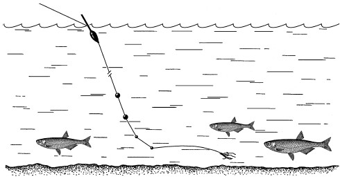 Рис. 81. Оснастка для ловли голавля впроводку При ловле на донную снасть хорошие результаты дает использование в качестве насадок мяса перловицы, линючих раков, пиявок. В конце лета и осенью голавль охотнее берет со дна на небольшого пескарика или лягушонка. Впрочем, на лягушонка можно ловить и в верхних слоях воды, в том числе спиннингом и нахлыстом. Крупных голавлей я предпочитаю ловить спиннингом на небольшие вращающиеся блесны (№ 0–3), окрашенные с внутренней стороны в красный или черный цвет. Но иногда, особенно в пасмурную погоду, этот хищник лучше берет на серебристые или золотистые вращалки. Хороши также заныривающие на глубину 2–3 метра воблеры желто‑зеленого или зеленого цвета. Длина их не должна превышать 5–6 см. Когда я отправляюсь за «широколобым», на одной из шпуль моей катушки всегда плетенка сечением 0,08‑0,10 мм, а на другой монолеска с разрывной нагрузкой до 3 кг. Ловлю нахлыстом можно начинать уже в мае, когда просветлеет вода. В это время голавль безотказно берет на майского жука, у которого предварительно отрывают жесткие надкрылья. В июне– июле в утренние и вечерние часы ловят на кузнечика и искусственные мушки, имитирующие обитающих по берегам данной реки насекомых. Качественная нахлыстовая катушка позволяет отпускать приманку по течению на значительное расстояние от рыболова, что не столь настораживает охотящихся в верхних слоях воды голавлей. Клюет голавль довольно решительно. Схватив с ходу приманку, он резко бросается в сторону, а затем упорно и бурно сопротивляется. Вываживание упрощается, если под рукой окажется подсачек с длинной ручкой. СЫРТЬ