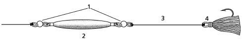 Рис. 119. Оснастка для ловли форели: 1 – вертлюжки; 2 – прозрачный поплавок «Сбирулино» (10–15 г); 3 – поводок из монолески длиной 70–80 см; 4 – стример Среди наиболее уловистых приманок для ловли форели у меня являются вращалки № 00‑3 от шведских фирм Myran и Aby Garcia как с оперением, так и без него. Цвет: серебро, золото, медь, черный. Хороши также стримеры зеленоватого, желтого и рыжего цветов. Иногда неплохо работают микро‑воблеры. Вообще, на мой взгляд, при ловле форели важно учитывать окраску кормовых объектов, которыми в данное время питается эта рыба. Уточнить это вы можете экспериментальным путем или с помощью местных рыболовов. По большому счету, успех во многом зависит от того, насколько вы в состоянии всякий раз приспосабливаться к изменяющимся условиям ловли. Это и есть верный путь к овладению секретами ловли такой замечательной рыбы, как форель. ЛЕНОК