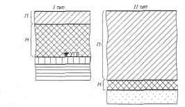 Рис. 134. Соотношение мощности просадочных и непросадочных грунтов в лессовых толщах I и II типа: П- грунты просадочные; Н— то же непросадочные