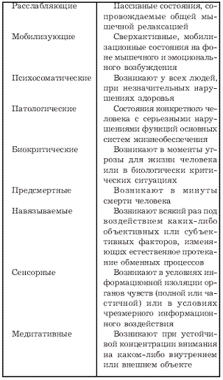 Все вышеперечисленные режимы работы организма различаются по своему психическому и физиологическому содержанию и поведенческому проявлению. Так, нормальные режимы – это обычные бодрствующие состояния человека. Определяются результатом работы головного мозга, его глубинных структур и текущей работой органов чувств. Возрастные режимы зависят от того, что с возрастом изменяются функциональные качества организма и личностные возможности человека. Специфическими отличиями обладают возрастные режимы у детей до 3 лет, подростков с 12 до 16 лет и пожилых людей с выраженными признаками старости. Психологические режимы отражают процессы взаимодействия человека с окружающими людьми и реальной действительностью. К специфически измененным режимам психики можно отнести состояния психологической напряженности или страха, навязчивые состояния и другие. Физические режимы возникают во всех случаях, когда человек находится в состоянии двигательной активности, например, выполняет физические упражнения. Наблюдается повышение мышечной активности, а также некоторая эмоциональная возбужденность. Расслабляющие режимы характеризуются снижением тонуса скелетной мускулатуры и вегетативного тонуса. Уменьшается активность сердечнососудистой, дыхательной, пищеварительной и выделительной систем. Одновременно на фоне общего торможения идут не менее глубокие процессы активизации некоторых функций организма и отдельных мозговых структур. Резко интенсифицируются все восстановительные процессы. Расслабляющие режимы могут возникать как при помощи специальных приемов психологического воздействия, так и в естественных условиях, когда снижается активность внимания и сознание как бы сужается. Отмечается у астеников, у некоторых излишне суеверных людей, у лиц, ослабленных соматическими заболеваниями, а также находящихся в удобной, располагающей ко сну позе. Эффект расслабления усиливается, если удается вызвать чувство глубокого внутреннего покоя и умиротворения, приятной тяжести и тепла во всем теле, успокоить дыхание. Способствует сужению сознания и общее утомление, наступающее в вечернее время после активной дневной работы, а также пасмурная или дождливая погода, слабая освещенность помещения (полумрак или свет синей лампы) и др. Помимо этого расслабляющие (тормозящие) режимы наблюдаются во время обычного сна, в периоды неполного засыпания или неполного пробуждения, в аутогенных, гипнотических и других состояниях. Мобилизующие режимы активизируют работу всех органов и систем, повышают вегетативный тонус, двигательную активность. Наиболее ярко выражены при занятиях спортом. Однако их воздействие на организм может быть разрушительным в результате чрезмерной психологической или физической нагрузки. Психосоматические, патологические, биокритические и предсмертные режимы сопровождаются пониженной двигательной активностью и особыми состояниями психики. Наиболее типичные их формы – некоторые нервные, соматические и психические угнетения деятельности организма, непродуктивные формы психомоторного возбуждения, сумеречные, бессознательные, анабиозные состояния и т. п. Навязываемые режимы изменяют естественное протекание психофизиологических процессов в организме. Возникают всякий раз при воздействии на человека псих