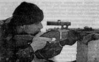 Как видно из таблицы, изменение боя винтовки по высоте при применении различных упоров и приложение их в различных местах может быть весьма значительным. Причем это явление наблюдается не только при стрельбе из боевых винтовок, но и из малокалиберных тоже. Во всех случаях при применении более жесткого упора бой винтовки повышается. Разница боя по высоте при упорах ближе к патроннику или дальше от него, к дульному срезу, составляет 7-8 см. В учебном процессе отработка приемов стрельбы с упором ценна тем, что в спокойном устойчивом положении стрелок быстрее приобретает правильные навыки прицеливания и спуска курка. И даже опытные стрелки не брезгуют тем, что время от времени возвращаются к стрельбе с упора. Зачем они это делают? Если человек долго стрелял без применения упора - стоя, с колена или лежа с применением ремня, то при стрельбе с упора он вдруг явственно обнаруживает погрешности в работе пальца на спуске, которые при других стрелковых изготовках ему стали привычны и поэтому незаметны. Стрелок с удивлением может констатировать, что он дергает за спуск, или даже тянет его в сторону, или же спуск не тянется вообще. Знание своих ошибок способствует их исправлению. Как уже было упомянуто, грудная клетка стрелка приподнята и корпус опирается в основном на левый локоть, если стрелок стреляет способом поддержки за цевье, или равномерно на оба локтя, если стрелок левой рукой поддерживает правильное положение приклада в плече. Для обеспечения постоянства боя упор должен находиться на одном определенном месте и иметь постоянную жесткость, близкую к жесткости руки. И место приложения упора должно соответствовать месту приложения на винтовке левой руки при стрельбе без упора. Поэтому жесткий упор рекомендуется прикрывать скаткой шинели, дерном либо чем-нибудь другим мягким. При стрельбе способом захвата левой кистью цевья оружия стрелок не столько поддерживает винтовку, сколько фиксирует ее и прижимает к мягкому упору. Обратите внимание на то, что левая рука стрелка в перчатке (фото 109). Это необходимо для того, чтобы пульсация руки гасилась мягкой перчаткой и не действовала на оружие. Приклад в плечо следует прижимать плотно. Отдача как магазинных, так и автоматических винтовок велика и существенна. Если приклад плотно прижат к плечу, винтовка при выстреле сильно толкнет назад. Толкнет, но не ударит. А если приклад не прижат, то она ударит, и довольно ощутимо. Приставлять приклад в плечо следует в районе плечевой выемки, ни правее и ни левее. Размещать приклад в плече слишком низко нельзя: отдачей оружие может выбить назад, вниз из-под плеча, и оптическим прицелом разбить стрелку нос или переносицу. Такие случаи с новичками нередки. Слишком высоко приклад ставить тоже не надо - это неудобно. Приклад ставится и не слишком низко, и не слишком высоко. Место упора приклада в плечо оказывает большое влияние на положение средней точки попадания. Если приклад упирается в плечо верхней частью, бой оружия понижается; при упоре нижней частью наблюдается повышение боя. Поэтому положение приклада в плече должно быть постоянным по высоте. "Играть" прикладом вверх-вниз нельзя: при этом наблюдается разброс по высоте, причем существенный. Для достижения постоянства боя требуется однообразная изготовка к стрельбе. Нарушение этого однообразия в