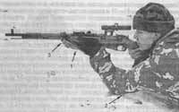В боевой обстановке подходящий упор найти непросто. Носить его с собой - тяжело. В практике подвижного боя в составе разведдиверсионной или егерско-поисковой группы приспосабливать винтовку для стрельбы на упоре долго, да и взять его в подвижном огневом контакте негде. Поэтому снайперы старой формации, которым приходилось стрелять с побежками и перебежками, падая, поднимаясь для мгновенного рывка метров на 40-50 и снова падая, мгновенно изготавливаясь для стрельбы, исповедуют спортивный способ стрельбы лежа с ремня. Упором для такого способа стрельбы служит обыкновенный брезентовый общевойскового формата оружейный ремень. Изготовка для такой стрельбы отличается от стрельбы с упора. Разумеется, отсутствует сам упор. Винтовочный ремень, играющий его роль, охватывает руку стрелка между локтем и плечом. Ремень выбирается такой длины, чтобы при изготовке он был натянут и вес оружия приходился на него (1 на фото 110 и фото 111 - справа и слева). Внимательно посмотрите на эти фотографии. Центр тяжести оружия приходится на левую руку в перчатке, а общая опора оружия - на левый локоть. Оружие, естественно, тянет вперед, от стрелка. Но уйти ему вперед препятствует ремень, перехлестнутый за руку выше локтя (2 на фото 110, 111). При длинном ремне оружие будет выдвинуто вперед, при слишком коротком оно будет чрезмерно упираться в плечо и не впишется в изготовку. На согнутой руке с натянутым ремнем оптимальной длины, выбранной для конкретного стрелка, винтовка может "стоять" хоть два часа неподвижно, как на упоре. Крепление ремня к оружию производится отдельным ремешком (3 на фото 110, 111). Можно также использовать штатный ремень в его штатном креплении, перебросив за локоть и подогнав до необходимой длины (фото 112). При этом левая рука удерживает винтовку, захватывая ее за выточки на ложе.