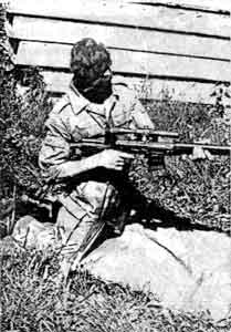 Обратите внимание, что на всех приведенных к данному разделу фотографиях снайпер работает с ремнем, в достаточной степени натянутым и перехлестнутым за левую руку между локтем и плечом. И при тренировках, и при боевой работе знающие снайперы никогда не будут игнорировать методику стрельбы с применением ремня. Изложенные в настоящем пособии способы стрельбы с применением ружейного ремня придают оружию такую же устойчивость, как и при стрельбе с упора. Но при маневренных боевых действиях в условиях внезапности, скоротечности и непредсказуемости применение упора исключается - его просто негде будет взять. А штатный винтовочный ремень всегда находится при оружии. Поэтому даже при перебежках снайперы стараются этот ремень с левой руки не снимать, чтобы не терять времени для его "накручивания" при необходимости немедленной стрельбы. От немецких егерей пришел так называемый егерский способ стрельбы. Суть его видна на фото 151. Носки при этом следует плотно прижать к грунту. Способ этот применяется при стрельбе в невысоком кустарнике и в развалинах.